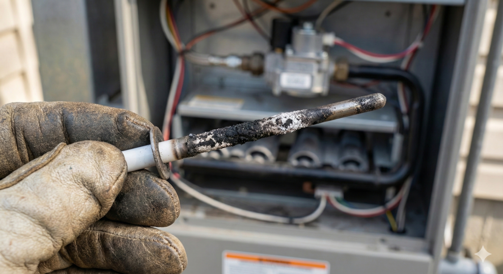 The “Flame Sensor” Issue (Furnaces) This is a small metal rod that sits in the fire. Its only job is to tell the computer board, “Yes, there is fire present.” Over time, it gets coated in carbon. If it gets too dirty, it can’t sense the flame, and the furnace will shut down the gas valve for safety. Annual cleaning is essential.